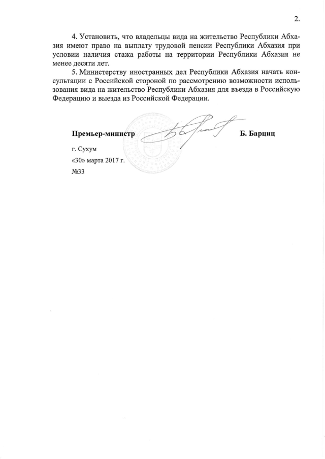 Постановление Кабинета Министров Республики Абхазия от 30.03.2017 № 33 "Об утверждении формы бланка документальной книжки вида на жительство Республики Абхазия и его описания, порядка выдачи или продления срока действия вида на жительство Республики Абхазия и формы заявления о выдаче или продлении срока действия вида на жительство Республики Абхазия"