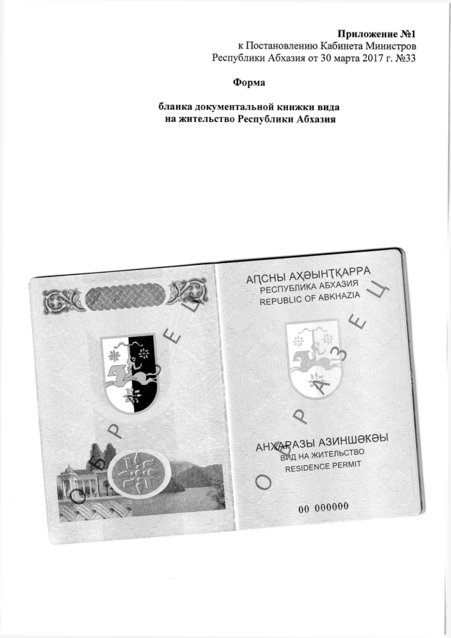 Постановление Кабинета Министров Республики Абхазия от 30.03.2017 № 33 "Об утверждении формы бланка документальной книжки вида на жительство Республики Абхазия и его описания, порядка выдачи или продления срока действия вида на жительство Республики Абхазия и формы заявления о выдаче или продлении срока действия вида на жительство Республики Абхазия"