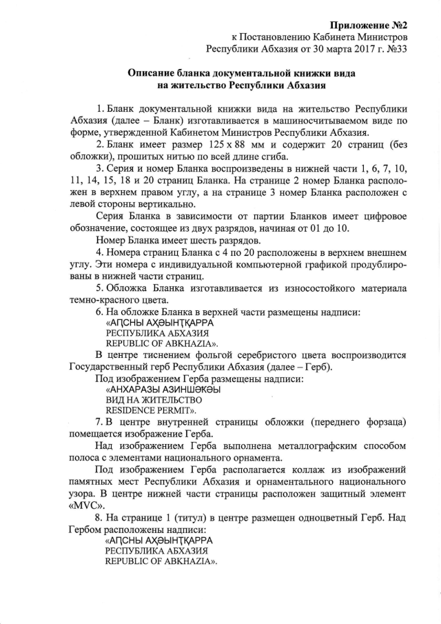 Постановление Кабинета Министров Республики Абхазия от 30.03.2017 № 33 "Об утверждении формы бланка документальной книжки вида на жительство Республики Абхазия и его описания, порядка выдачи или продления срока действия вида на жительство Республики Абхазия и формы заявления о выдаче или продлении срока действия вида на жительство Республики Абхазия"