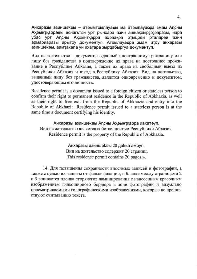 Постановление Кабинета Министров Республики Абхазия от 30.03.2017 № 33 "Об утверждении формы бланка документальной книжки вида на жительство Республики Абхазия и его описания, порядка выдачи или продления срока действия вида на жительство Республики Абхазия и формы заявления о выдаче или продлении срока действия вида на жительство Республики Абхазия"