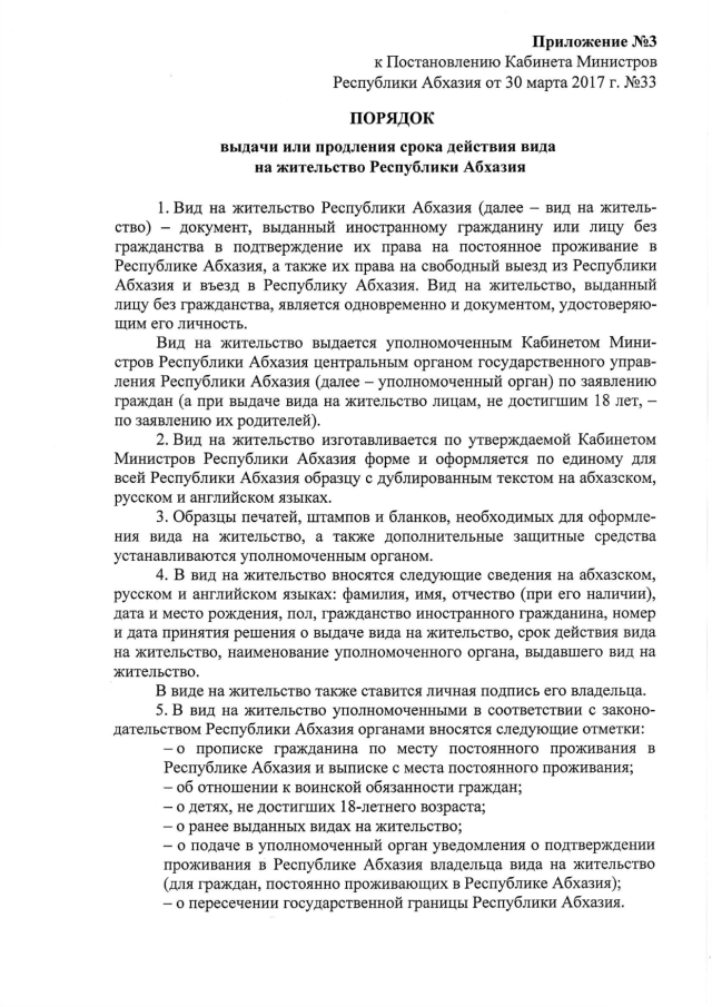 Постановление Кабинета Министров Республики Абхазия от 30.03.2017 № 33 "Об утверждении формы бланка документальной книжки вида на жительство Республики Абхазия и его описания, порядка выдачи или продления срока действия вида на жительство Республики Абхазия и формы заявления о выдаче или продлении срока действия вида на жительство Республики Абхазия"