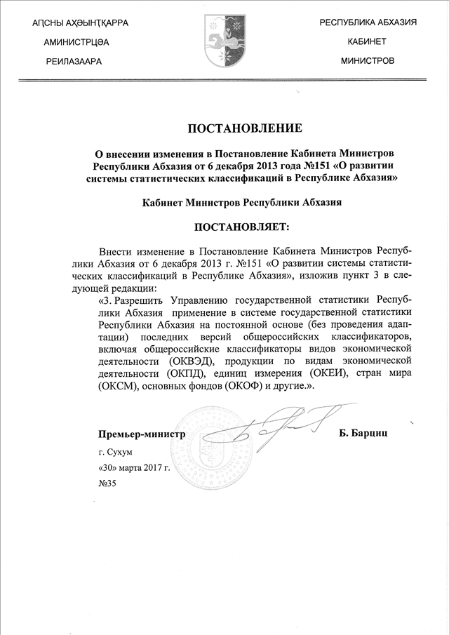 Постановление Кабинета Министров Республики Абхазия от 30.03.2017 № 35 "О внесении изменения в Постановление Кабинета Министров Республики Абхазия от 6 декабря 2013 года № 151 "О развитии системы статистических классификаций в Республике Абхазия"