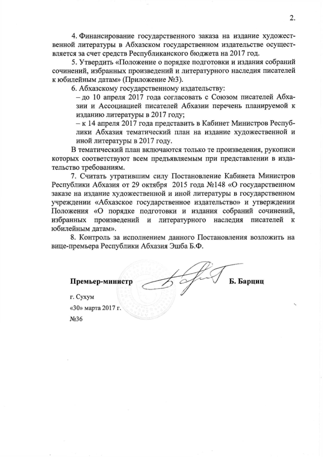 Постановление Кабинета Министров Республики Абхазия от 30.03.2017 № 36 "О государственном заказе на издание художественной и иной литературы в Республиканском государственном учреждении "Абхазское государственное издательство> и утверждении "Положения о порядке подготовки и издания собраний сочинений, избранных произведений и литературного наследия писателей к юбилейным датам" на 2017 год"