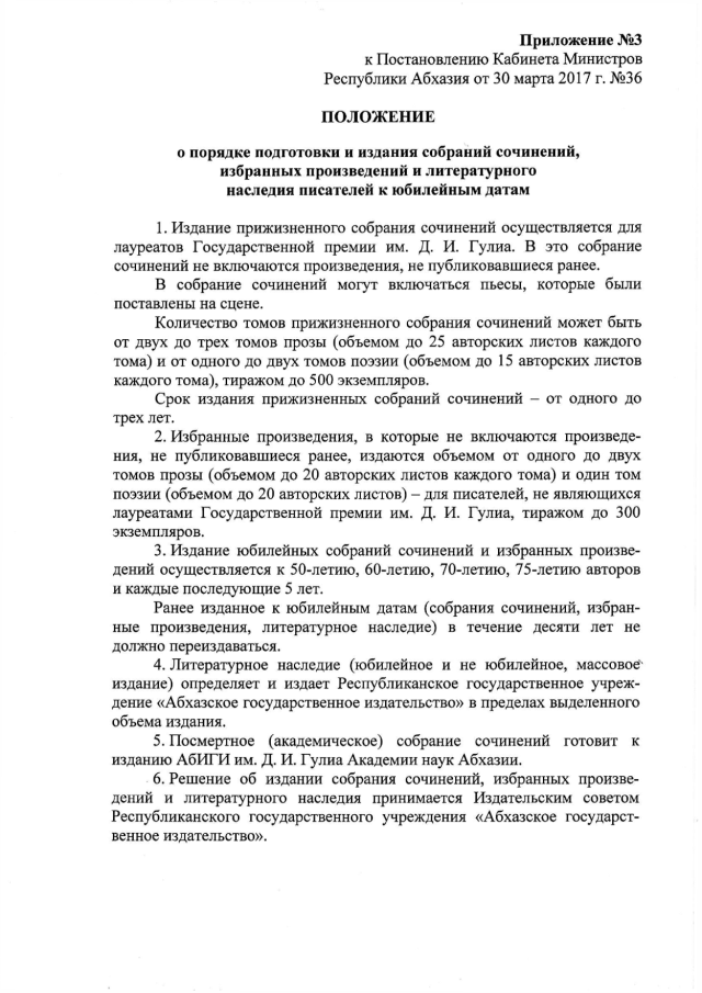 Постановление Кабинета Министров Республики Абхазия от 30.03.2017 № 36 "О государственном заказе на издание художественной и иной литературы в Республиканском государственном учреждении "Абхазское государственное издательство> и утверждении "Положения о порядке подготовки и издания собраний сочинений, избранных произведений и литературного наследия писателей к юбилейным датам" на 2017 год"