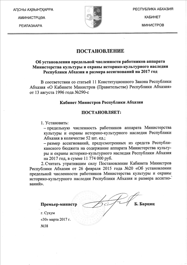 Постановление Кабинета Министров Республики Абхазия от 30.03.2017 № 38 "Об установлении предельной численности работников аппарата Министерства культуры и охраны историко-культурного наследия Республики Абхазия и размера ассигнований на 2017 год"