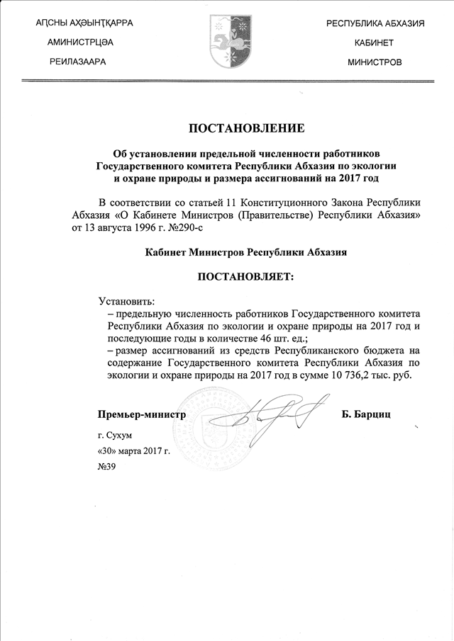 Постановление Кабинета Министров Республики Абхазия от 30.03.2017 № 39 "Об установлении предельной численности работников Государственного комитета Республики Абхазия по экологии и охране природы и размера ассигнований на 2017 год"