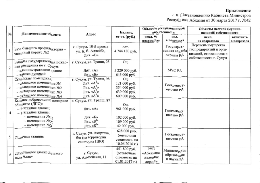 Постановление Кабинета Министров Республики Абхазия от 30.03.2017 № 42 "О внесении изменений и дополнений в Постановление Кабинета Министров Республики Абхазия от 06.06.2002 г. № 117 "О порядке оформления разграничения государственной собственности и формирования Реестра собственности"