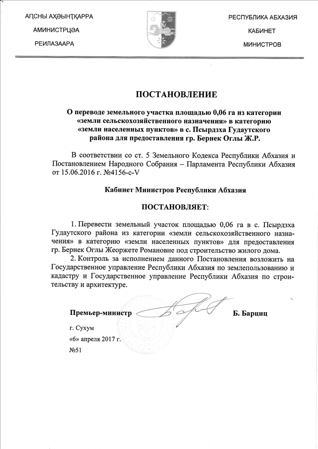 Постановление Кабинета Министров Республики Абхазия от 06.04.2017 № 51 "О переводе земельного участка площадью 0,06 га из категории "земли сельскохозяйственного назначения" в категорию "земли населенных пунктов" в с. Псырдзха Гудаутского района для предоставления гр. Бернек Оглы Ж.Р."