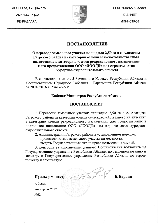 Постановление Кабинета Министров Республики Абхазия от 06.04.2017 № 52 "О переводе земельного участка площадью 2,50 га в с. Алахадзы Гагрского района из категории "земли сельскохозяйственного назначения" в категорию "земли рекреационного назначения" и его предоставлении ООО "ЛООДИ" под строительство курортно-оздоровительного объекта"