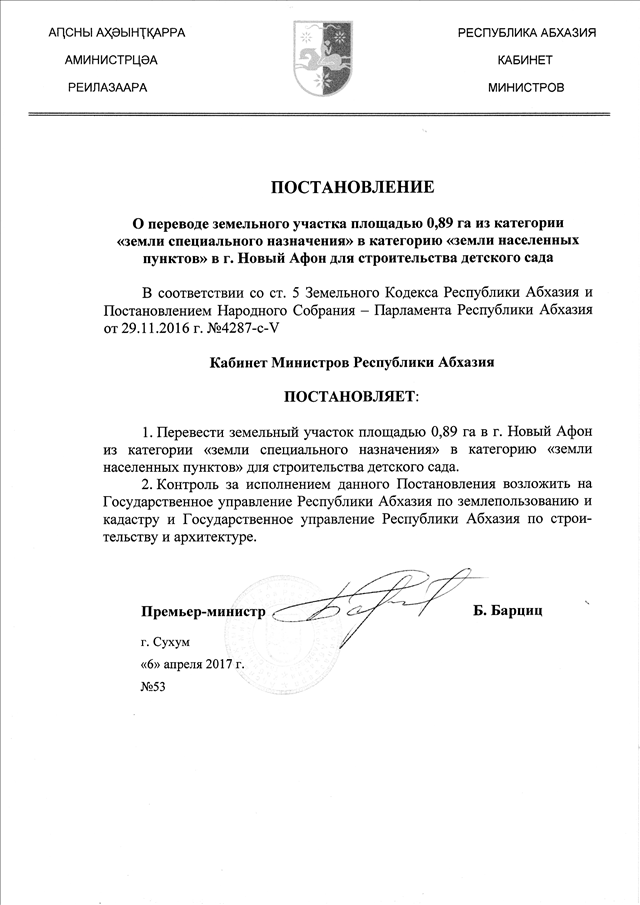 Постановление Кабинета Министров Республики Абхазия от 06.04.2017 № 53 "О переводе земельного участка площадью 0,89 га из категории "земли специального назначения" в категорию "земли населенных пунктов" в г. Новый Афон для строительства детского сада"