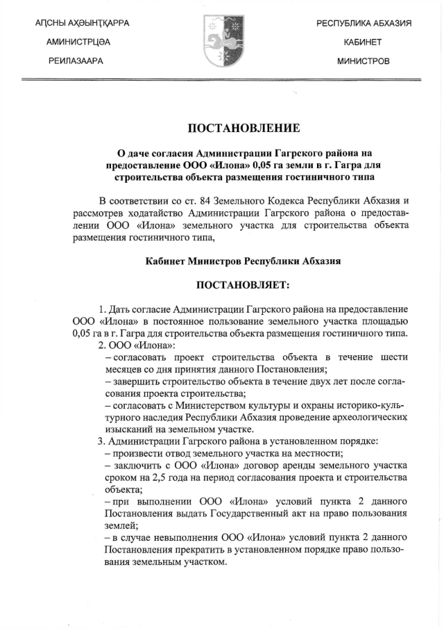 Постановление Кабинета Министров Республики Абхазия от 25.04.2017 № 58 "О даче согласия Администрации Гагрского района на предоставление ООО "Илона" 0,05 га земли в г. Гагра для строительства объекта размещения гостиничного типа"