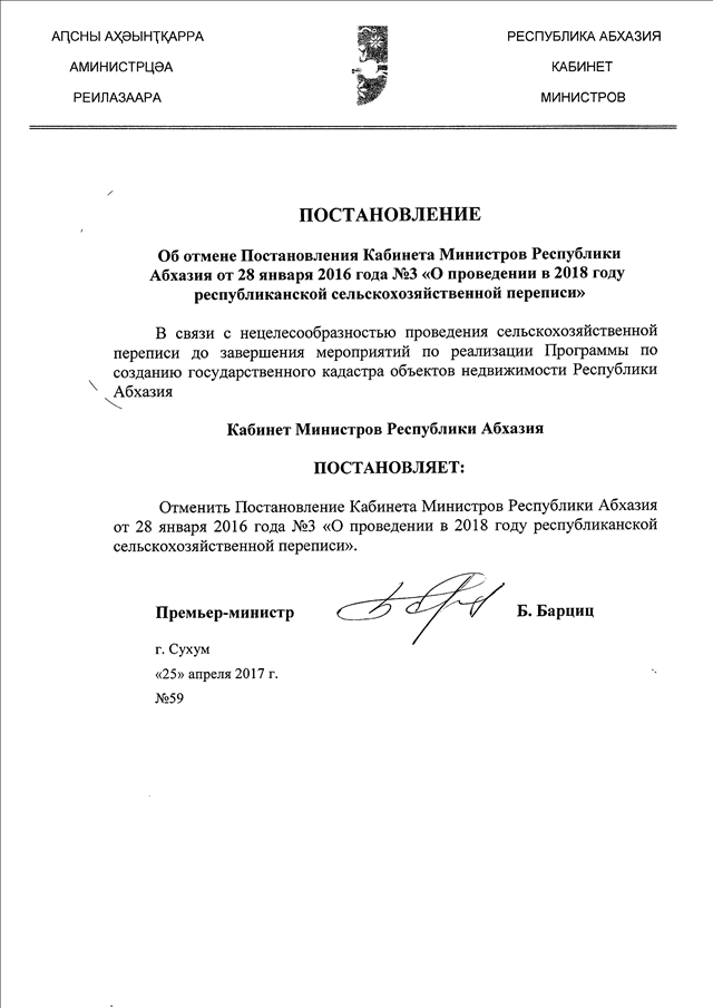 Постановление Кабинета Министров Республики Абхазия от 25.04.2017 № 59 "Об отмене Постановления Кабинета Министров Республики Абхазия от 28 января 2016 года № 3 "О проведении в 2018 году республиканской сельскохозяйственной переписи"