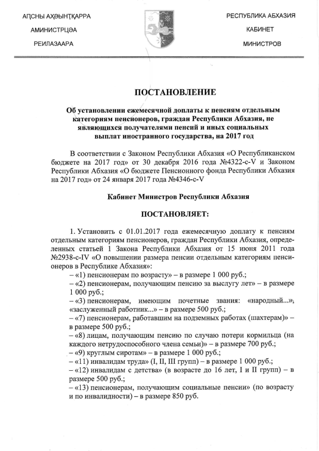 Постановление Кабинета Министров Республики Абхазия от 26.04.2017 № 60 "Об установлении ежемесячной доплаты к пенсиям отдельным категориям пенсионеров, граждан Республики Абхазия, не являющихся получателями пенсий и иных социальных выплат иностранного государства, на 2017 год"