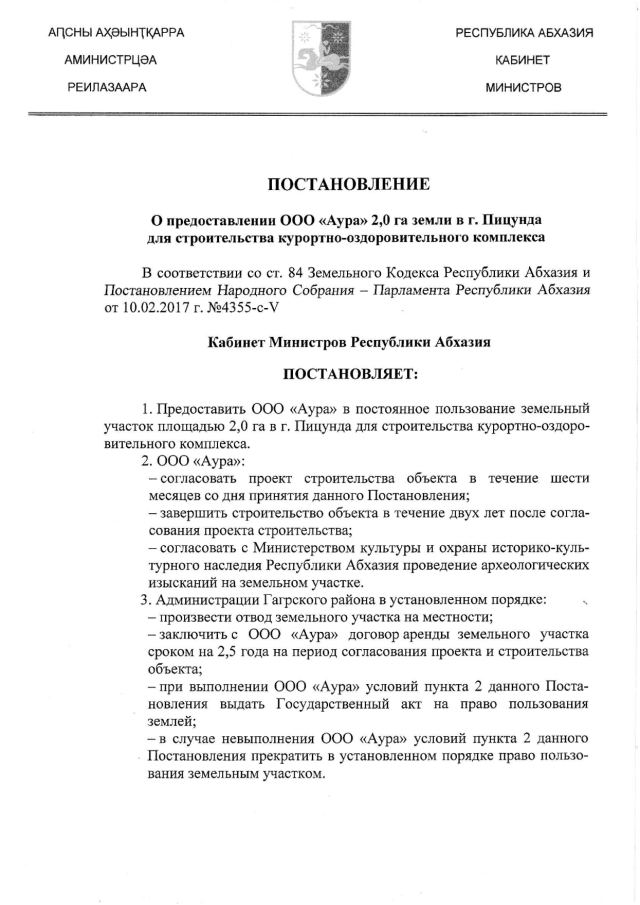 Постановление Кабинета Министров Республики Абхазия от 01.06.2017 № 63 "О предоставлении ООО "Аура" 2,0 га земли в г. Пицунда для строительства курортно-оздоровительного комплекса"