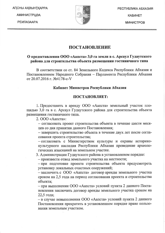 Постановление Кабинета Министров Республики Абхазия от 01.06.2017 № 65 "О предоставлении ООО "Аапста" 3,0 га земли в с. Арсаул Гудаутского района для строительства объекта размещения гостиничного типа"