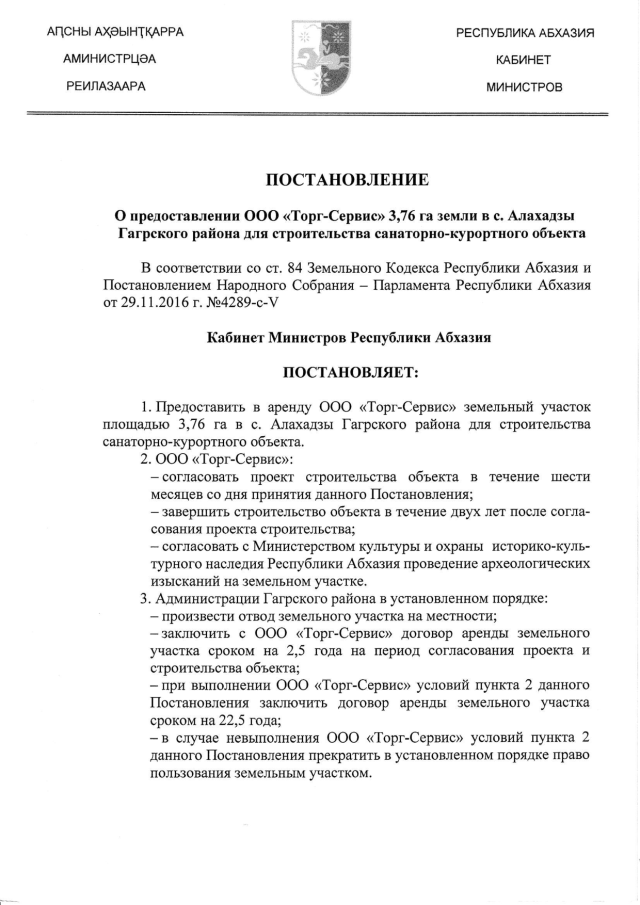 Постановление Кабинета Министров Республики Абхазия от 01.06.2017 № 64 "О предоставлении ООО "Торг-Сервис" 3,76 га земли в с. Алахадзы Гагрского района для строительства санаторно-курортного объекта"