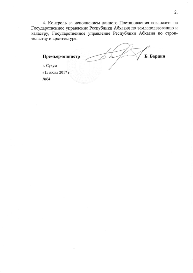 Постановление Кабинета Министров Республики Абхазия от 01.06.2017 № 64 "О предоставлении ООО "Торг-Сервис" 3,76 га земли в с. Алахадзы Гагрского района для строительства санаторно-курортного объекта"