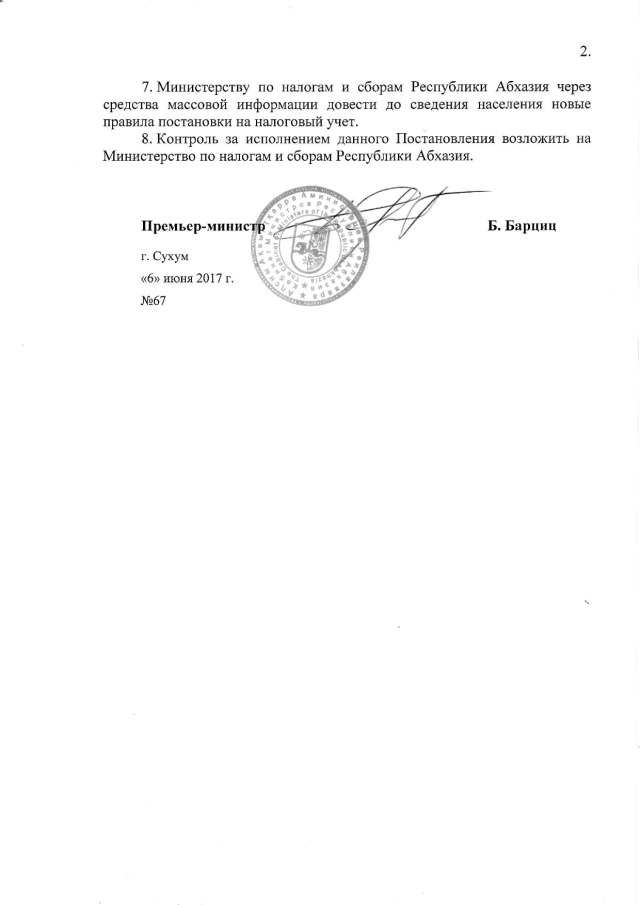 Постановление Кабинета Министров Республики Абхазия от 06.06.2017 № 67 "Об утверждении порядка постановки на налоговый учет юридических лиц и индивидуальных предпринимателей"