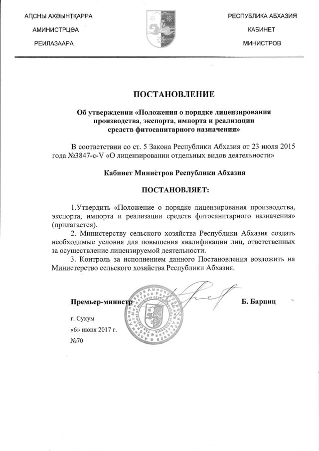 Постановление Кабинета Министров Республики Абхазия от 06.06.2017 № 70 "Об утверждении "Положения о порядке лицензирования производства, экспорта, импорта и реализации средств фитосанитарного назначения"