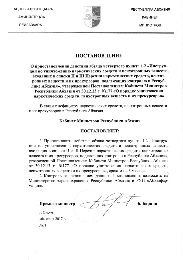 Постановление Кабинета Министров Республики Абхазия от 06.06.2017 № 71 "О приостановлении действия абзаца четвертого пункта 1.2 "Инструкции по уничтожению наркотических средств и психотропных веществ, входящих в списки II и III Перечня наркотических средств, психотропных веществ и их прекурсоров, подлежащих контролю в Республике Абхазия>, утвержденной Постановлением Кабинета Министров Республики Абхазия от 30.12.13 г. № 177 "О порядке уничтожения наркотических средств, психотропных веществ и их прекурсоров"