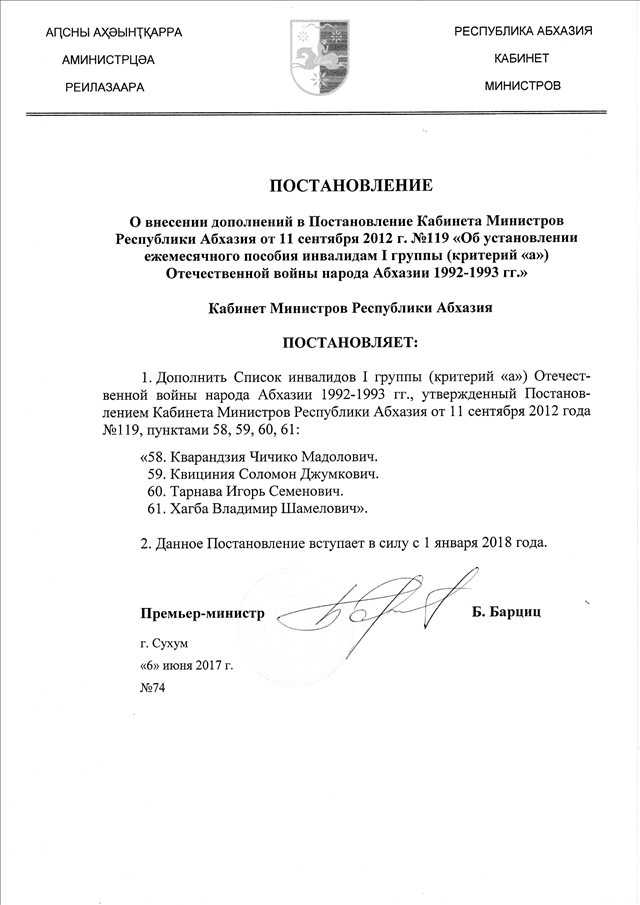 Постановление Кабинета Министров Республики Абхазия от 06.06.2017 № 74 "О внесении дополнений в Постановление Кабинета Министров Республики Абхазия от 11 сентября 2012 г. № 119 "Об установлении ежемесячного пособия инвалидам I группы (критерий "а") Отечественной войны народа Абхазии 1992-1993 гг."