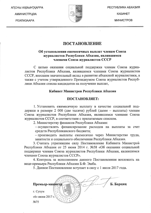 Постановление Кабинета Министров Республики Абхазия от 06.06.2017 № 75 "Об установлении ежемесячных выплат членам Союза журналистов Республики Абхазия, являвшимся членами Союза журналистов СССР"