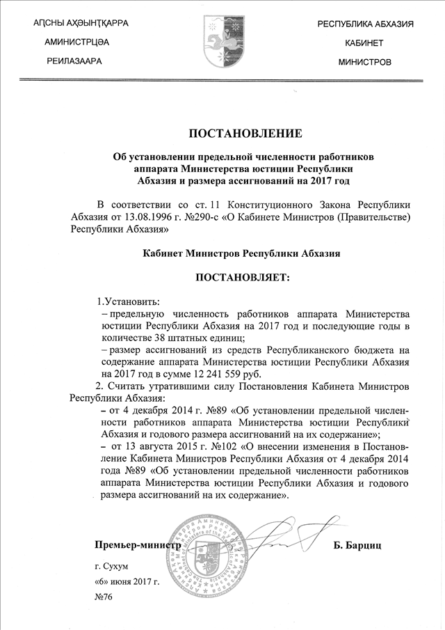 Постановление Кабинета Министров Республики Абхазия от 06.06.2017 № 76 "Об установлении предельной численности работников аппарата Министерства юстиции Республики Абхазия и размера ассигнований на 2017 год"