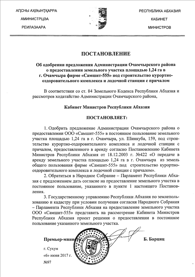 Постановление Кабинета Министров Республики Абхазия от 06.06.2017 № 97 "Об одобрении предложения Администрации Очамчырского района о предоставлении земельного участка площадью 1,24 га в г. Очамчыра фирме "Самшит-555" под строительство курортно-оздоровительного комплекса и лодочной станции с причалом"