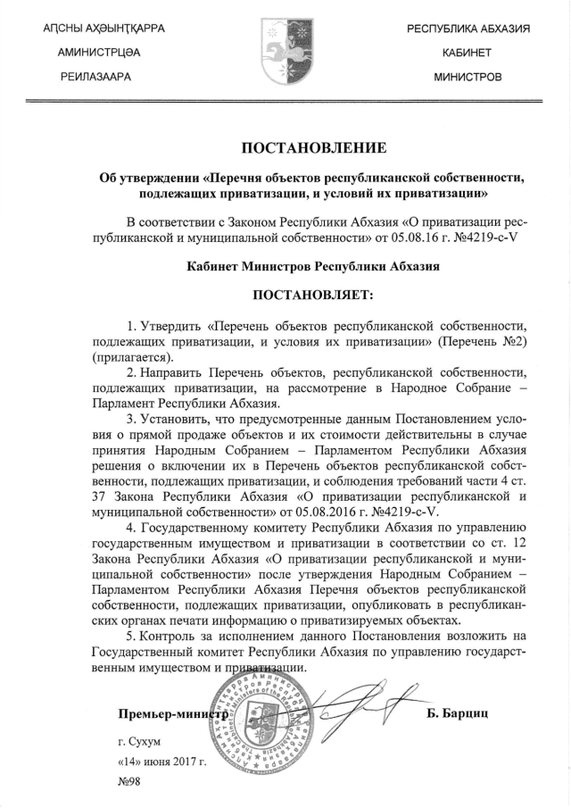 Постановление Кабинета Министров Республики Абхазия от 14.06.2017 № 98 "Об утверждении "Перечня объектов республиканской собственности, подлежащих приватизации, и условий их приватизации"
