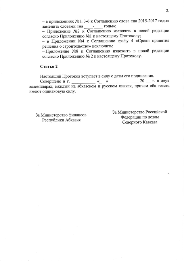 Постановление Кабинета Министров Республики Абхазия от 16.06.2017 № 99 "О проекте Протокола о внесении изменений в Соглашение между Министерством финансов Республики Абхазия и Министерством Российской Федерации по делам Северного Кавказа о порядке оказания финансовой помощи Республике Абхазия в целях осуществления бюджетных инвестиций в рамках реализации Инвестиционной программы содействия социально-экономическому развитию Республики Абхазия на 2015-2017 годы"