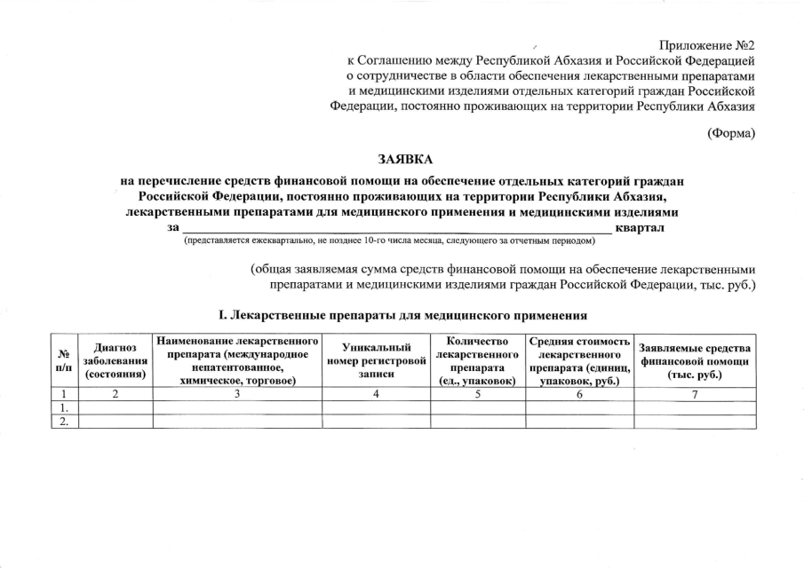Постановление Кабинета Министров Республики Абхазия от 19.06.2017 № 100 "О проекте Соглашения между Республикой Абхазия и Российской Федерацией о сотрудничестве в области обеспечения лекарственными препаратами и медицинскими изделиями отдельных категорий граждан Российской Федерации, постоянно проживающих на территории Республики Абхазия"
