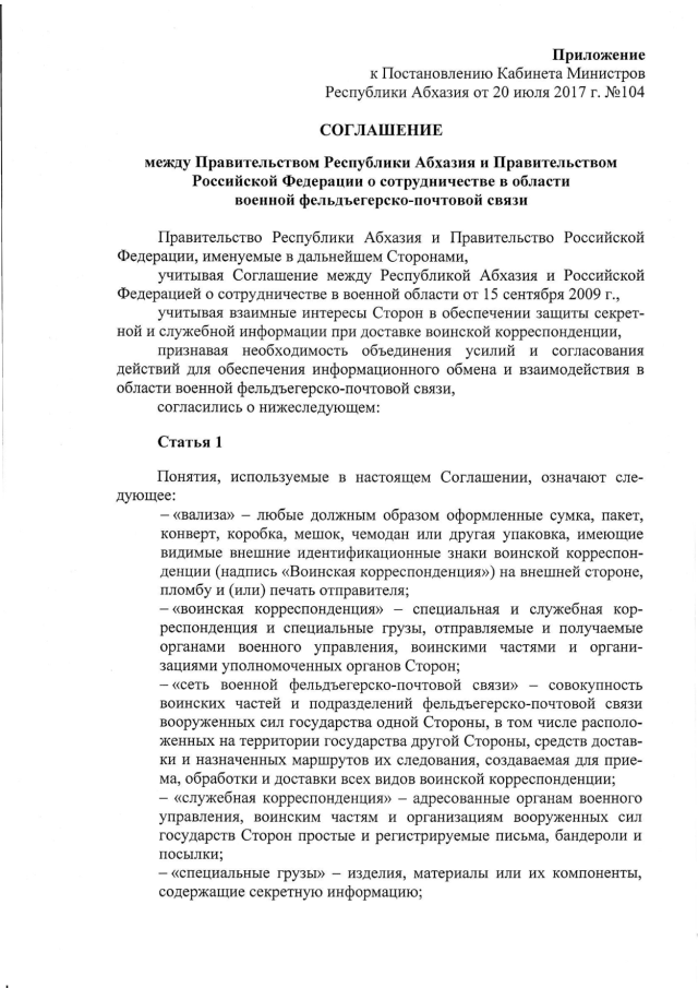 Постановление Кабинета Министров Республики Абхазия от 20.07.2017 № 104 "О заключении Соглашения между Правительством Республики Абхазия и Правительством Российской Федерации о сотрудничестве в области фельдъегерско-почтовой связи"