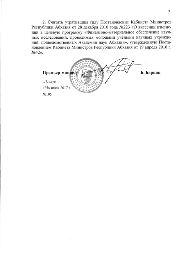 Постановление Кабинета Министров Республики Абхазия от 25.07.2017 № 105 "О внесении изменений в целевую программу "Финансово-материальное обеспечение научных исследований, проводимых молодыми учеными научных учреждений, подведомственных Академии наук Абхазии", утвержденную Постановлением Кабинета Министров Республики Абхазия от 19 апреля 2016 г. № 42"
