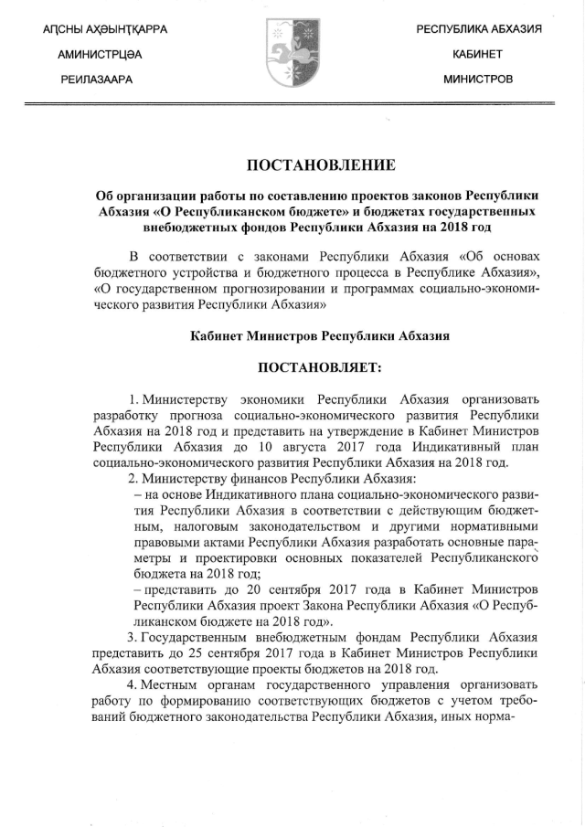 Постановление Кабинета Министров Республики Абхазия от 26.07.2017 № 106 "Об организации работы по составлению проектов законов Республики Абхазия "О Республиканском бюджете" и бюджетах государственных внебюджетных фондов Республики Абхазия на 2018 год"