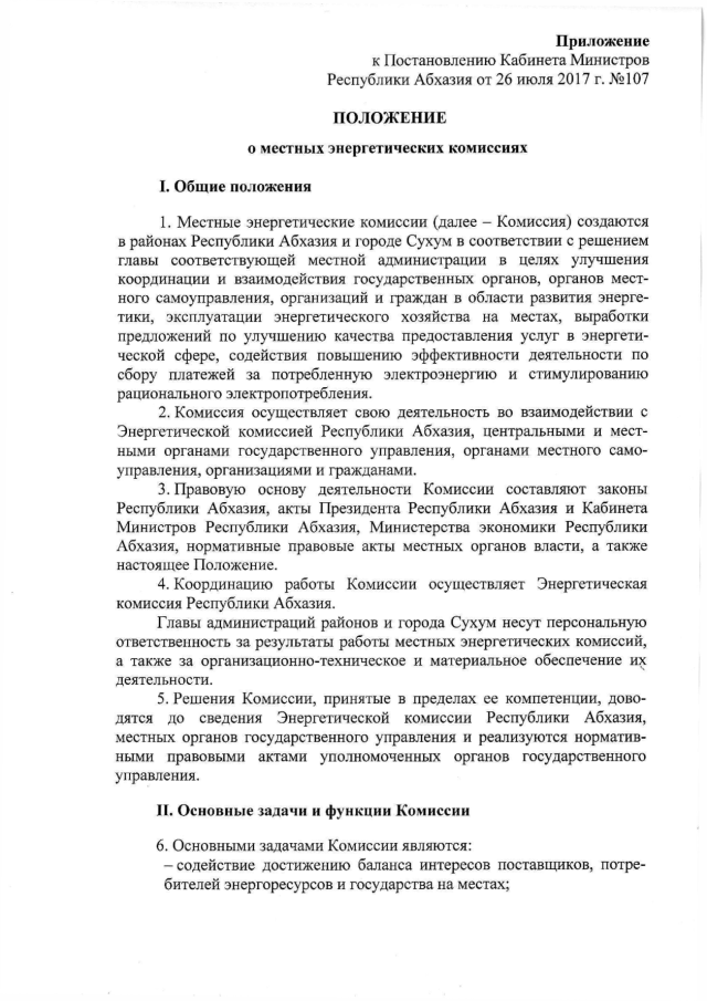 Постановление Кабинета Министров Республики Абхазия от 26.07.2017 № 107 "О мерах по развитию энергетической отрасли, улучшению показателей собираемости платежей и рациональному использованию электроэнергии в административно-территориальных единицах Республики Абхазия"