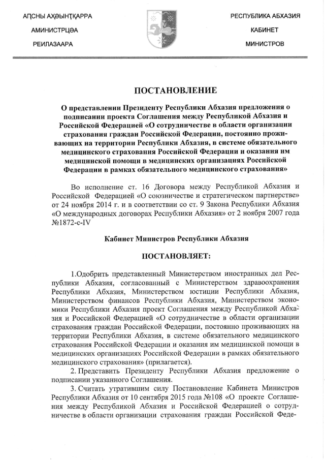 Постановление Кабинета Министров Республики Абхазия от 26.07.2017 № 110 "О представлении Президенту Республики Абхазия предложения о подписании проекта Соглашения между Республикой Абхазия и Российской Федерацией "О сотрудничестве в области организации страхования граждан Российской Федерации, постоянно проживающих на территории Республики Абхазия, в системе обязательного медицинского страхования Российской Федерации и оказания им медицинской помощи в медицинских организациях Российской Федерации в рамках обязательного медицинского страхования"
