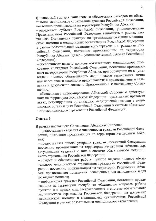 Постановление Кабинета Министров Республики Абхазия от 26.07.2017 № 110 "О представлении Президенту Республики Абхазия предложения о подписании проекта Соглашения между Республикой Абхазия и Российской Федерацией "О сотрудничестве в области организации страхования граждан Российской Федерации, постоянно проживающих на территории Республики Абхазия, в системе обязательного медицинского страхования Российской Федерации и оказания им медицинской помощи в медицинских организациях Российской Федерации в рамках обязательного медицинского страхования"