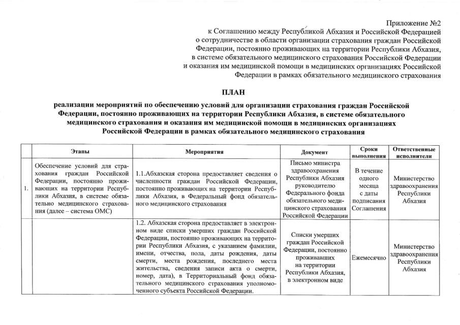 Постановление Кабинета Министров Республики Абхазия от 26.07.2017 № 110 "О представлении Президенту Республики Абхазия предложения о подписании проекта Соглашения между Республикой Абхазия и Российской Федерацией "О сотрудничестве в области организации страхования граждан Российской Федерации, постоянно проживающих на территории Республики Абхазия, в системе обязательного медицинского страхования Российской Федерации и оказания им медицинской помощи в медицинских организациях Российской Федерации в рамках обязательного медицинского страхования"