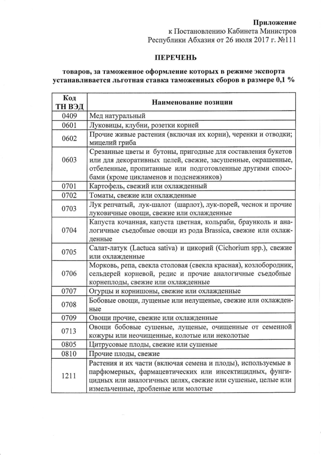 Постановление Кабинета Министров Республики Абхазия от 26.07.2017 № 111 "О ставках таможенных сборов за таможенное оформление товаров"
