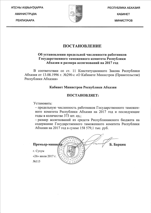 Постановление Кабинета Министров Республики Абхазия от 26.07.2017 № 115 "Об установлении предельной численности работников Государственного таможенного комитета Республики Абхазия и размера ассигнований на 2017 год"