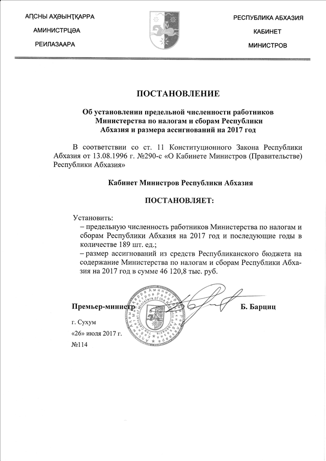 Постановление Кабинета Министров Республики Абхазия от 26.07.2017 № 114 "Об установлении предельной численности работников Министерства по налогам и сборам Республики Абхазия и размера ассигнований на 2017 год"
