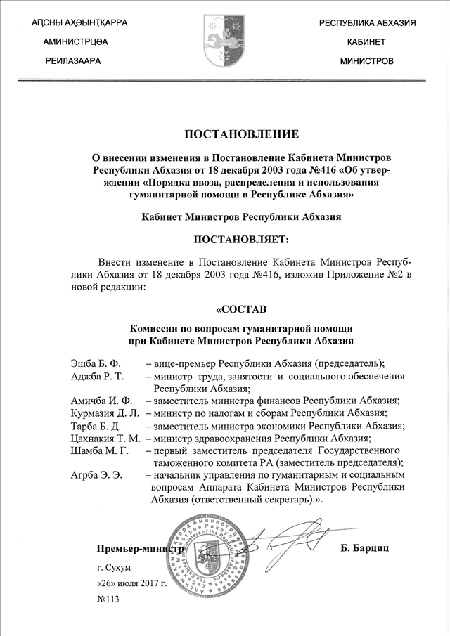 Постановление Кабинета Министров Республики Абхазия от 26.07.2017 № 113 "О внесении изменения в Постановление Кабинета Министров Республики Абхазия от 18 декабря 2003 года № 416 "Об утверждении "Порядка ввоза, распределения и использования гуманитарной помощи в Республике Абхазия"