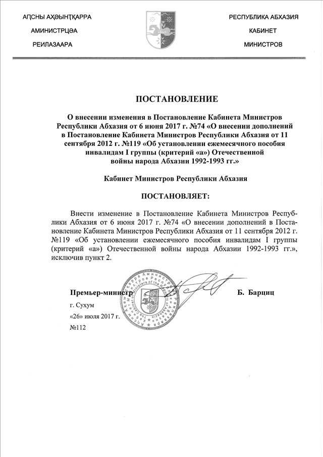 Постановление Кабинета Министров Республики Абхазия от 26.07.2017 № 112 "О внесении изменения в Постановление Кабинета Министров Республики Абхазия от 6 июня 2017 г. № 74 "О внесении дополнений в Постановление Кабинета Министров Республики Абхазия от 11 сентября 2012 г. №119 <Об установлении ежемесячного пособия инвалидам I группы (критерий "а") Отечественной войны народа Абхазии 1992-1993 гг."