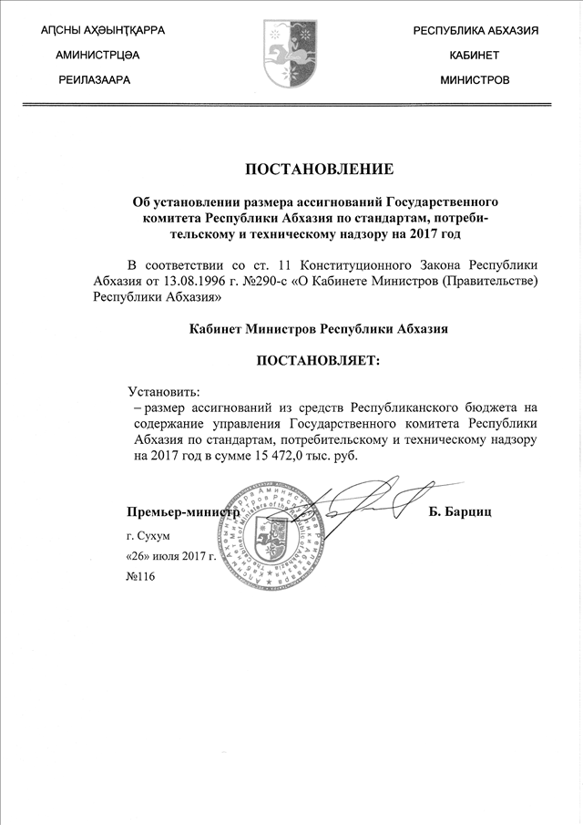 Постановление Кабинета Министров Республики Абхазия от 26.07.2017 № 116 "Об установлении размера ассигнований Государственного комитета Республики Абхазия по стандартам, потребительскому и техническому надзору на 2017 год"