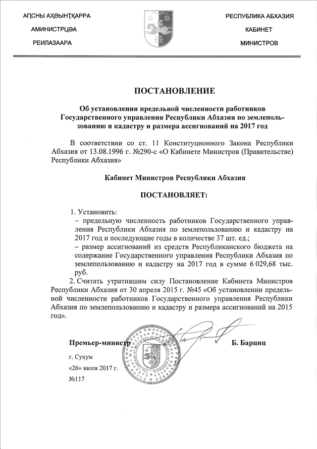 Постановление Кабинета Министров Республики Абхазия от 26.07.2017 № 117 "Об установлении предельной численности работников Государственного управления Республики Абхазия по землепользованию и кадастру и размера ассигнований на 2017 год"