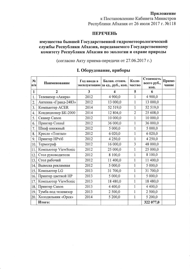 Постановление Кабинета Министров Республики Абхазия от 26.07.2017 № 118 "Об установлении предельной численности работников Государственного комитета Республики Абхазия по экологии и охране природы и размера ассигнований на 2017 год"