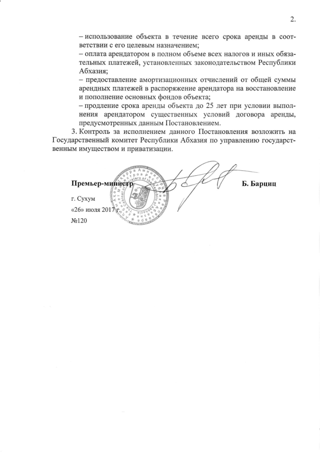 Постановление Кабинета Министров Республики Абхазия от 26.07.2017 № 120 "О передаче в аренду имущественного комплекса пансионата "Абхазия"