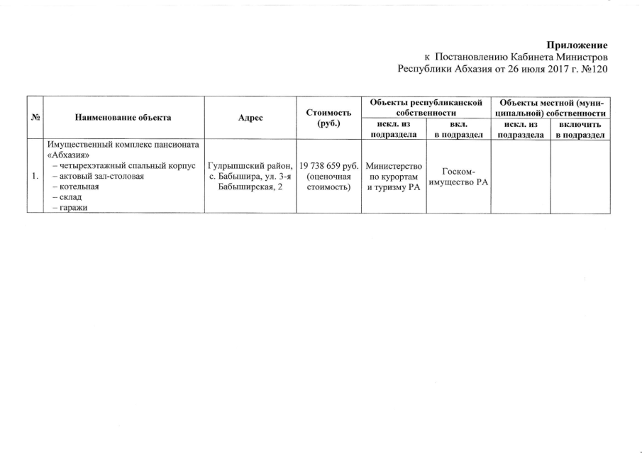 Постановление Кабинета Министров Республики Абхазия от 26.07.2017 № 120 "О передаче в аренду имущественного комплекса пансионата "Абхазия"