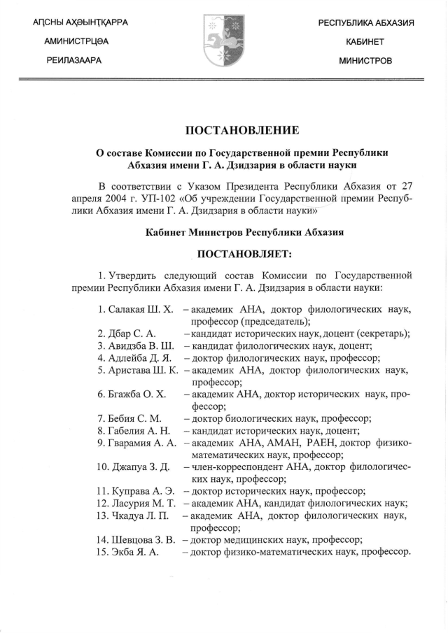 Постановление Кабинета Министров Республики Абхазия от 26.07.2017 № 119 "О составе Комиссии по Государственной премии Республики Абхазия имени Г.А. Дзидзария в области науки"