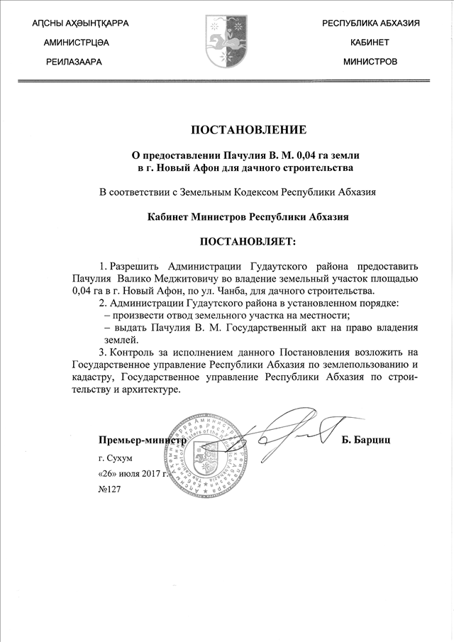 Постановление Кабинета Министров Республики Абхазия от 26.07.2017 № 127 "О предоставлении Пачулия В.М. 0,04 га земли в г. Новый Афон для дачного строительства"